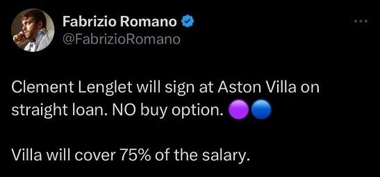 Conforme relatos do repórter, o Barcelona encontra-se em vias de finalizar um acordo de empréstimo com o Aston Villa para Clement Lenglet. O futebolista francês parece não contar com oportunidades na formação do Barça, e a administração do clube optou por mais um empréstimo como alternativa.